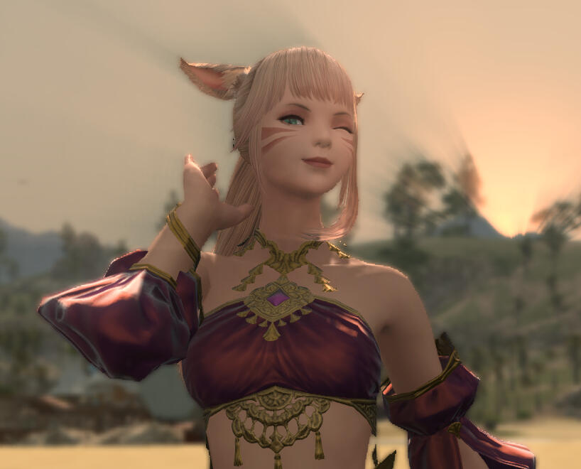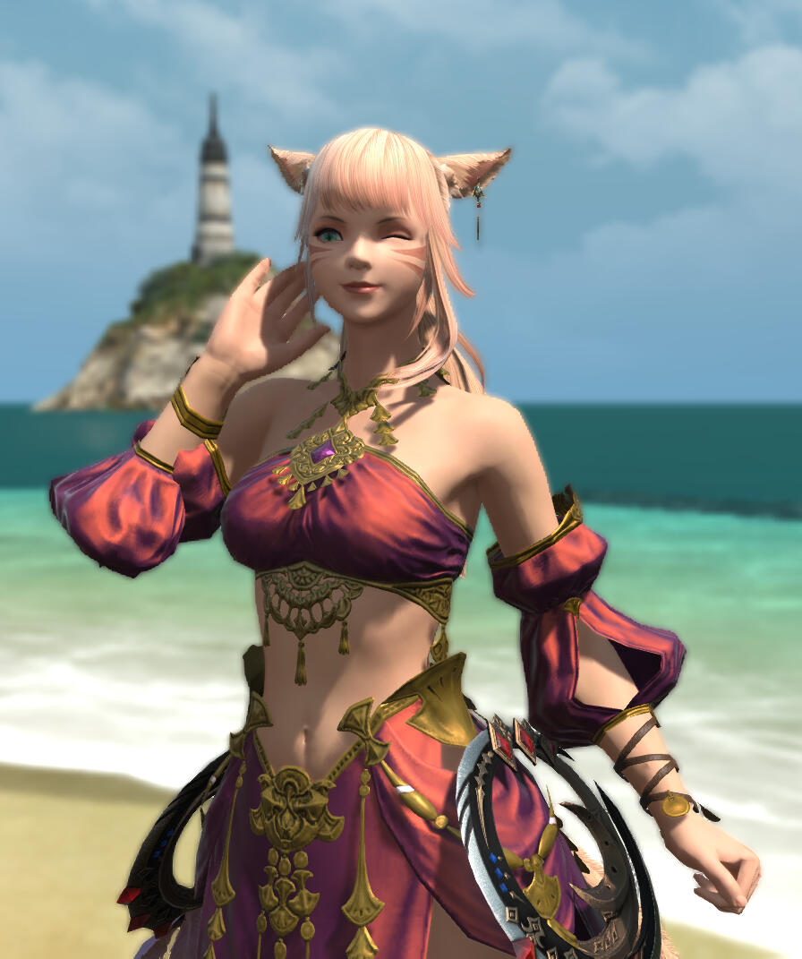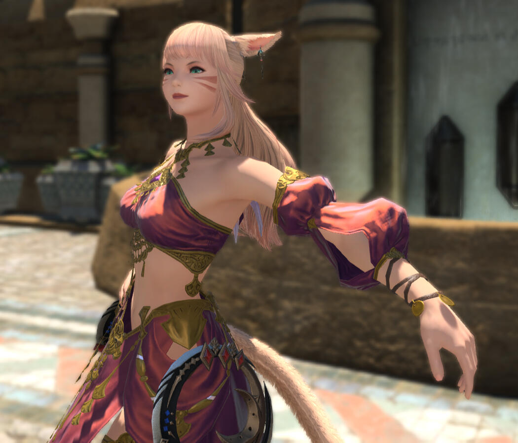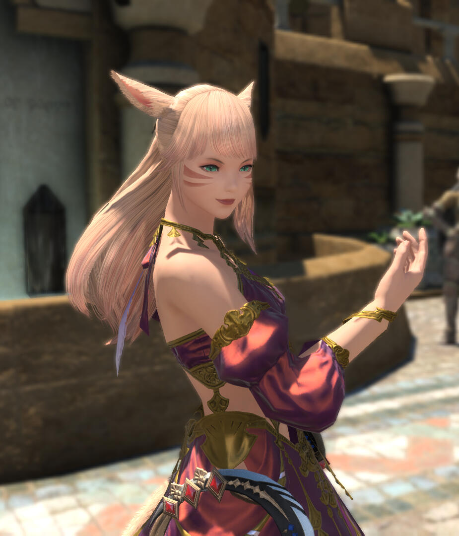 Likes: Dancing, hunting, cooking, the color red, talking, emeralds, Thavnarian style, warm weather, rainDislikes: Nunhs, cold weather, slavers, Ul'dahs underground, melee combatSecrets: Athersickness from traveling via Aetheryte, has sensitive ears and tail